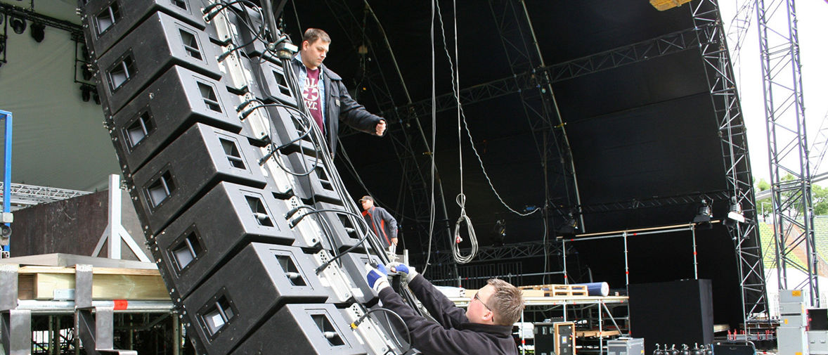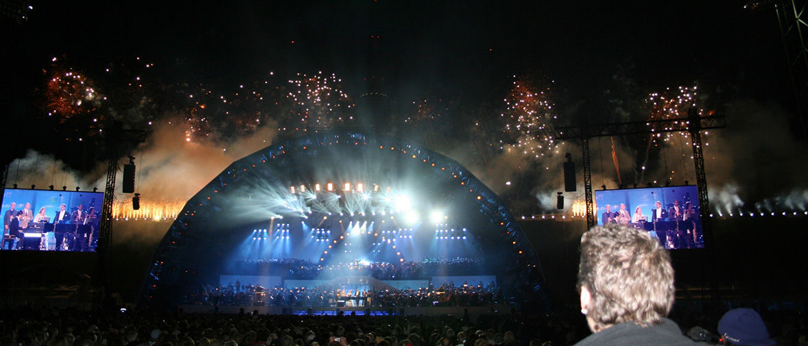 "Es war klar, welchen Anforderungen wir gegenüber standen," erzählt Ralf Zuleeg vom d&b Anwender-Support. "Dies war in erster Linie ein Orchester-Event, obwohl auch bekannte Künstler aus den Bereichen Pop, Oper und Klaviermusik auftreten sollten, von Placido Domingo bis Lang Lang. Die Pegel mussten auf allen 28 000 Sitzplätzen als angenehm empfunden werden. Mit einem verteilten Delay-System ist dies kein allzu großes Problem. Zweitens musste das Hauptsystem auf der Bühne in eine Links/Mitte/Rechts-Konfiguration aufgeteilt werden, damit durch eine vorsichtige Anwendung der Zeitverzögerung das Klangbild so verschoben werden konnte, dass es mit dem zum jeweiligen Zeitpunkt spielenden Orchester übereinstimmte."