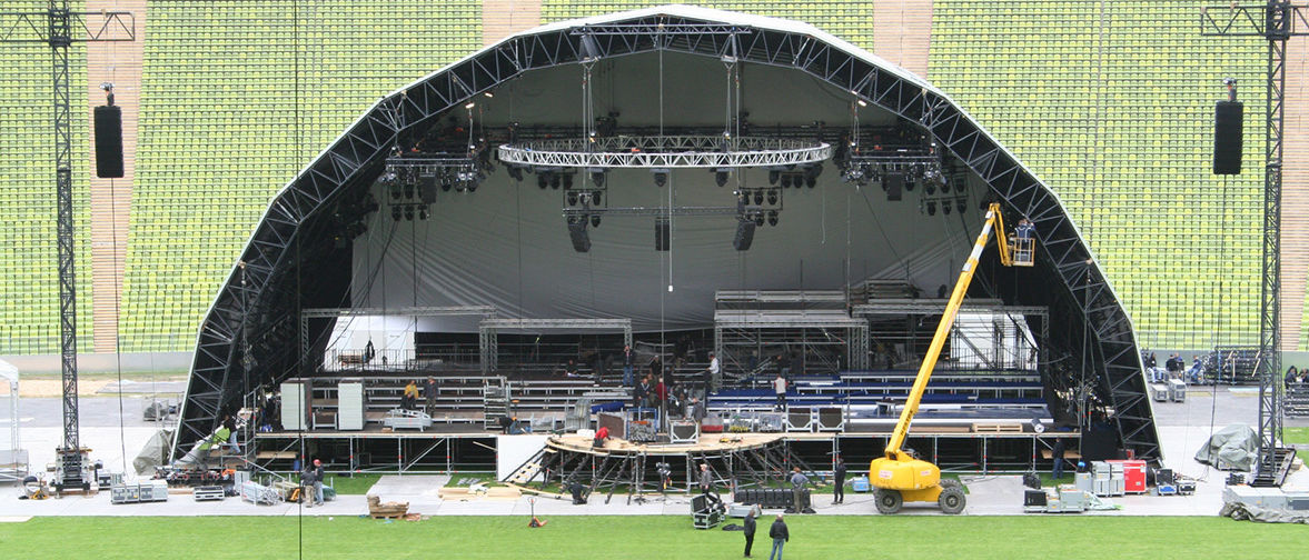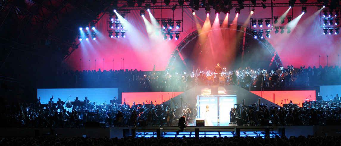 Diese architektonische Neuerung diente der Beschallungsfirma Neumann & Mueller als Inspirationsquelle, als sie gebeten wurde, im Rahmen der Eröffnungen der WM 2006 ein ganz besonderes Konzertereignis zu gestalten. Das zentrale Konzept sah so aus: Drei Orchester sollten auf einer einzigen Bühne auftreten. Orchester eins und drei nebeneinander auf der Vorbühne und Orchester zwei auf einer erhöhten Plattform, verstärkt durch einen Chor im mittleren Teil. Dazu natürlich eine nicht geringe Zahl von Star-Solisten.
