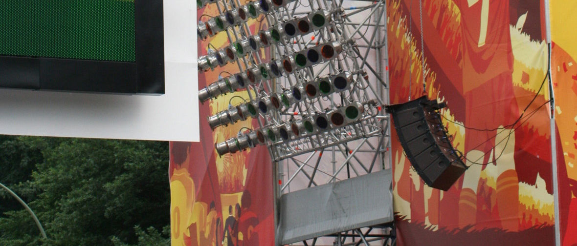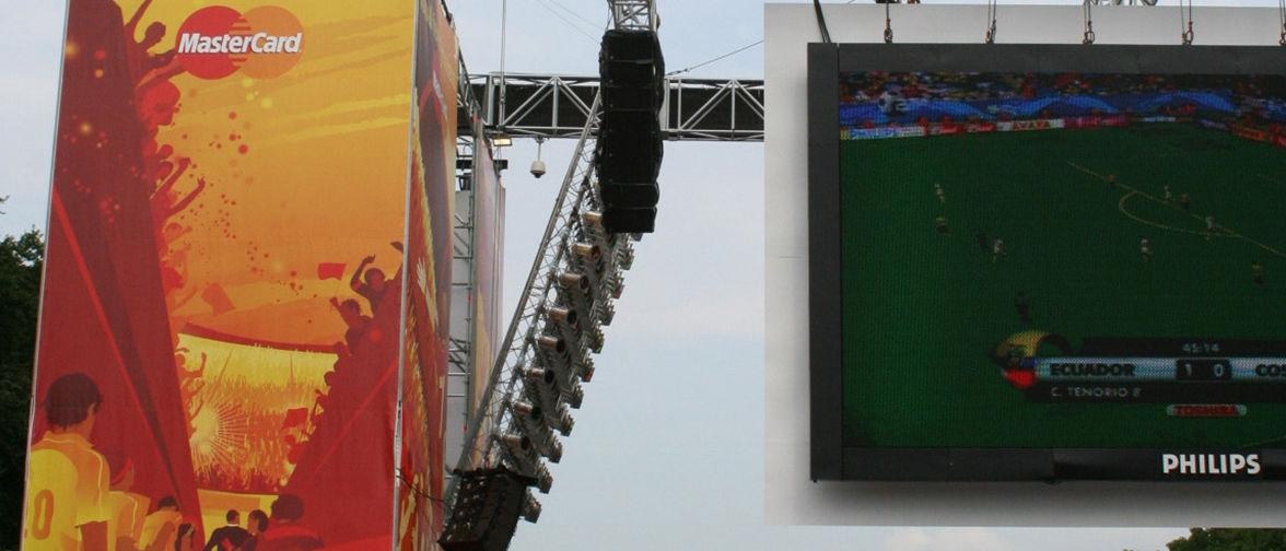 Bis zu einer Million Fußballfans vor riesigen Bildschirmen in vier Bereichen mit einer Bildschirmfläche von insgesamt 234 Quadratmetern einschließlich eines 60 Quadratmeter großen Bildschirms über der Bühne am berühmtesten Bauwerk Berlins, dem Brandenburger Tor. So sah das Fan Fest aus, Deutschlands längste Party, die anlässlich der FIFA Weltmeisterschaft vom 7. Juni bis zum 9. Juli stattfand. Die Megaparty erstreckte sich über eine Strecke von zwei Kilometern entlang der Straße des 17. Juni und endete an der Siegessäule. Die Fanmeile bedeckte eine Fläche von 77 000 Quadratmetern, oder umgerechnet zwölf Fußballfeldern. Natürlich benötigte dieser Bereich ein Klangsystem, das die Fans mit der für die WM-Atmosphäre erforderlichen Akustik versorgen und auch die Veranstaltungen am Rand beschallen konnte. Nach Spielende wurde die Meile jeden Abend zu Berlins größter Tanzfläche. Und um Mitternacht wurde der neue Tag jedes Mal durch eine Lasershow angekündigt. Die Düsseldorfer Audiospezialisten von Tonart waren für den guten Ton auf der Fanmeile zuständig, eine Herausforderung, die sie gerne annahmen. "Wir haben eine Vielzahl von Lautsprechersystemen benutzt", erläutert Daniel Will von Tonart, "aber für die Delay Lines wählten wir die Q1 von d&b audiotechnik, weil wir wussten, dass die ihrer Aufgabe gerecht werden konnten. Sie sind sehr einfach zu hängen und zu verkabeln." Daniel Will benutzte die E-PAC Verstärker von d&b, um die vielen Q1en auf der Fanmeile anzusteuern. Das System verstärkte nicht nur den Sound von Top DJs, sondern auch vom Deutschen Symphonieorchester, das am 2. Juli ein Klassikkonzert gab. Zusätzlich zur Fanmeile gab es die Fanschleife, die sich vom Reichstagsgebäude bis zum Stadtzentrum erstreckte. In diesem Bereich lag die Adidas Arena, eine 1:10 Nachbildung des Olympiastadions (siehe Bericht 'Das 13. Stadion'). Die Arena bot Public Viewing, Shops und vielfältige kulturelle Unterhaltung für zehntausend Fans. Nun da das Endspiel vorüber ist, und wir wissen, wer die besten Fußballspieler der Welt sind, die Italiener den Titel mit nach Hause genommen haben und auch der letzte Fan abgereist ist, kehrt die Fanmeile unter der majestätischen Präsenz des Brandenburger Tors wieder zur Normalität zurück. Für dieses historische Monument, das auf Geheiß Friedrich Wilhelms II im Jahre 1791 als Zeichen des Friedens errichtet wurde, war die Weltmeisterschaft nur ein kleines Stück Geschichte in der Kette der vielen historischen Ereignisse, die in seinem Schatten stattgefunden haben. Und, auch das sei gesagt, nicht das schlechteste.